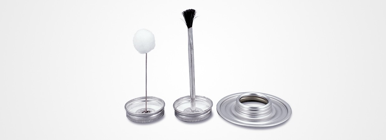 Monotop cans and Daubers Brush in cans components like applicators,plain bottom or bottom with beads,prime tinplate,screw cap with daubers brush closed tight.